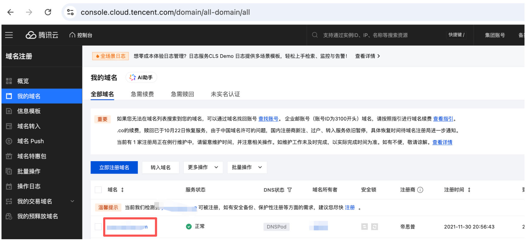 一、首先可以选择直接注册一个新的域名(点击注册新域名即可前往),注册成功之后的状态如下图所示: