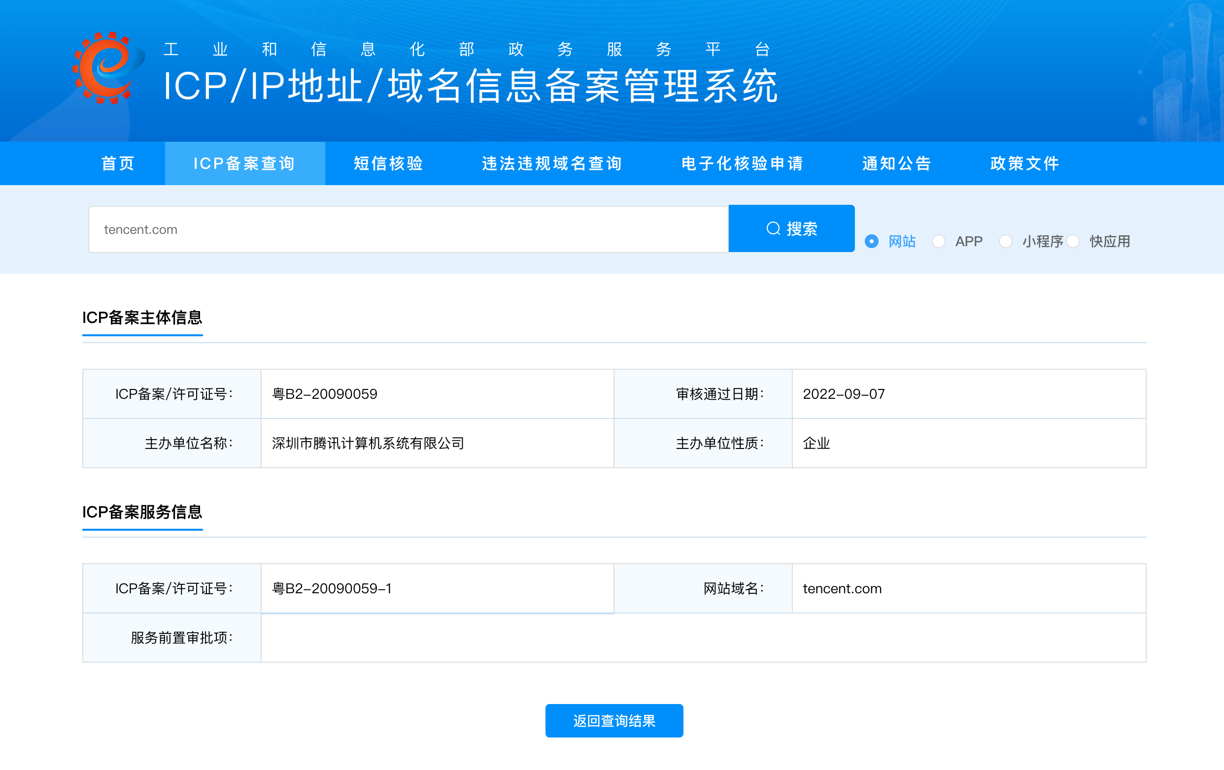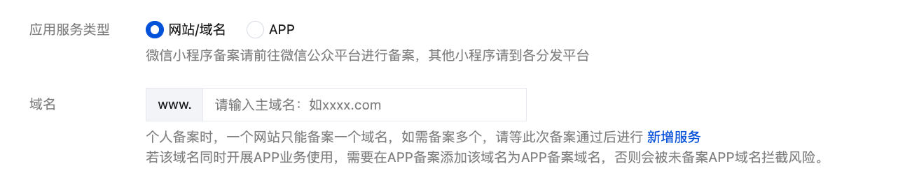 提示:此处填写的域名须为二级域名。例如:tencent.com为二级域名,而cloud.tencent.com则为子域名。那么在查询备案信息时,则需要使用tencent.com来查询。
