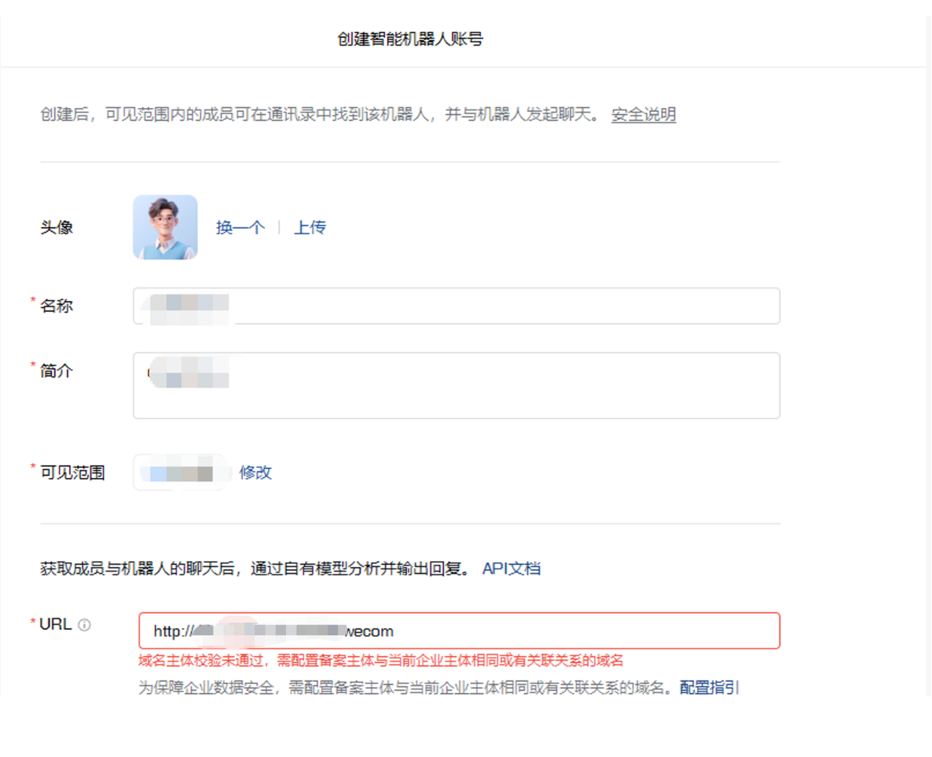 如果你的企业微信已经进行了企业认证,那么在创建机器人配置URL时,必须要配置已经完成备案且备案主体和认证企业一致的域名,否则会提示”域名主体校验未通过,需配置备案主题与当前企业主体相同或有关联关系的域名“,如下图所示: