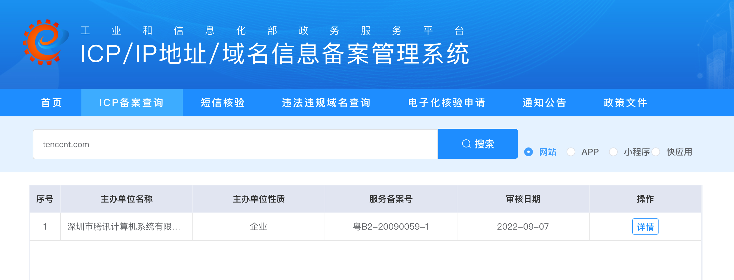 点击操作列的详情按钮,查看具体的备案信息: