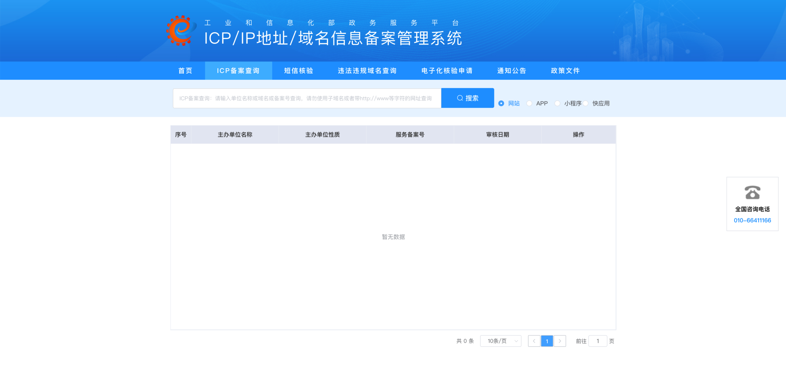 一、前往工信部备案查询网站,进入ICP备案查询页: