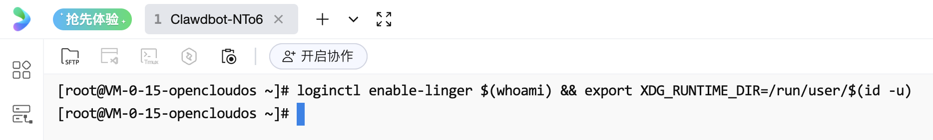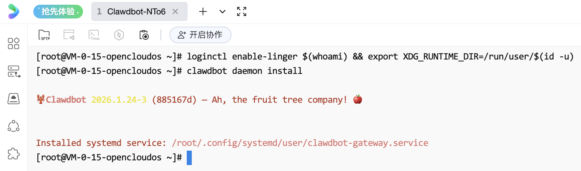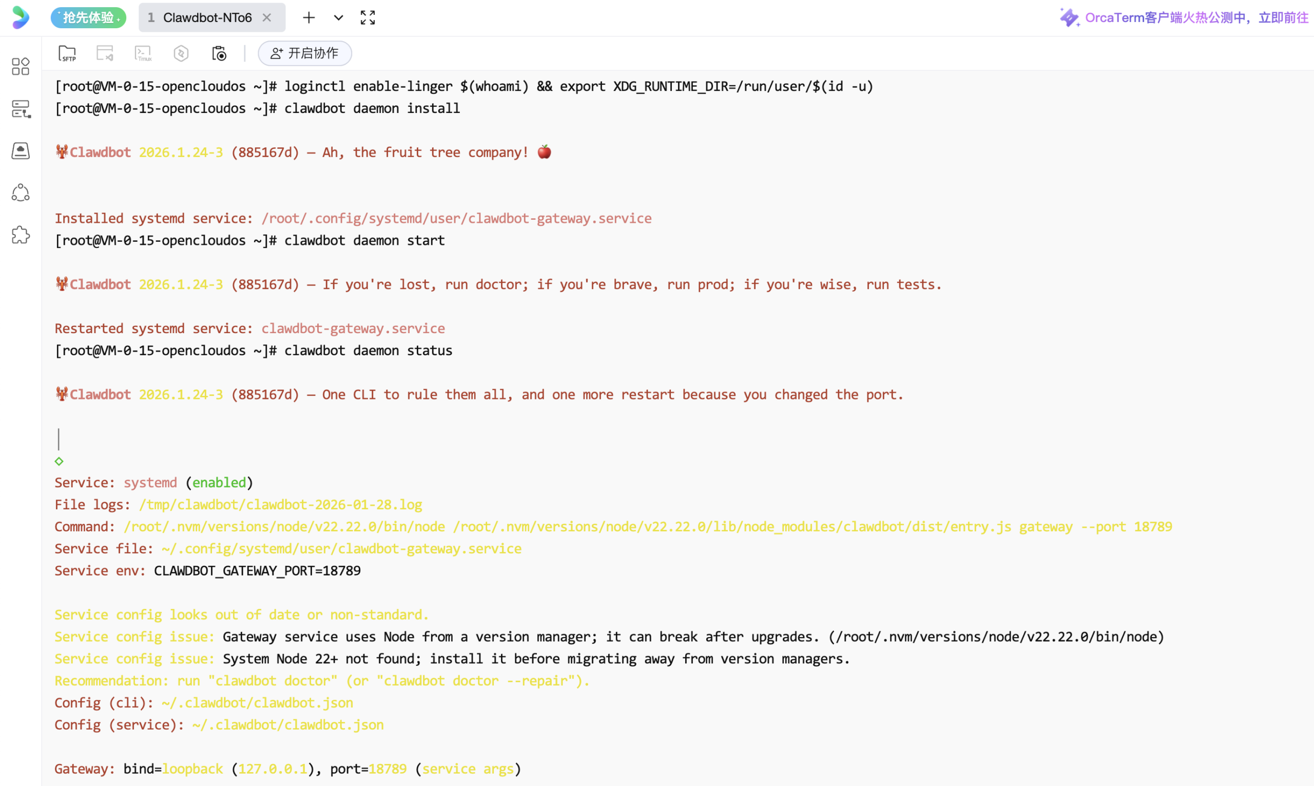 问题的原因是因为前面步骤中运行的命令,都只是“临时运行”,所以这里我们需要在前置的配置完成后,让OpenClaw(Clawdbot)运行在后台,这样的话我们关掉服务器命令行页面(OrcaTerm)后就不会和它失去联系了。