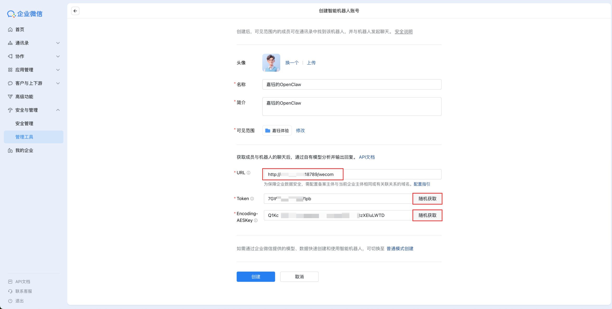 在切换后的页面,依次填写名称、简介、可见范围、URL,并且点击随机获取按钮生成Token和Encoding-AESKey(这是企业微信与OpenClaw进行加密通信的密钥)。注意此处先不用点击创建按钮。