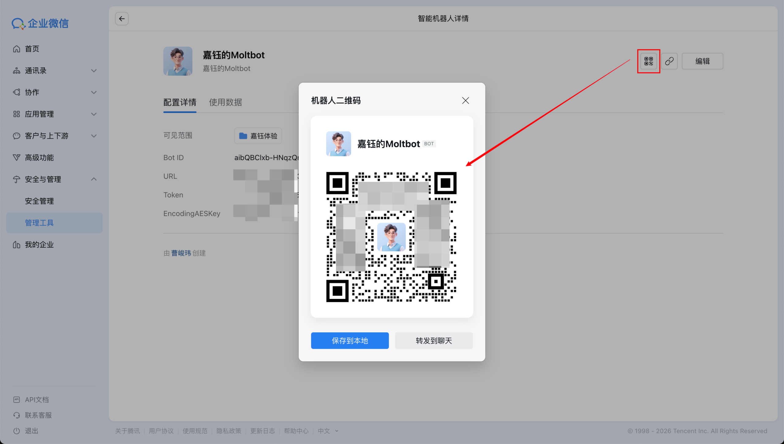 创建成功后,在接下来的页面中找到企业微信机器人的二维码,用手机扫码后添加。