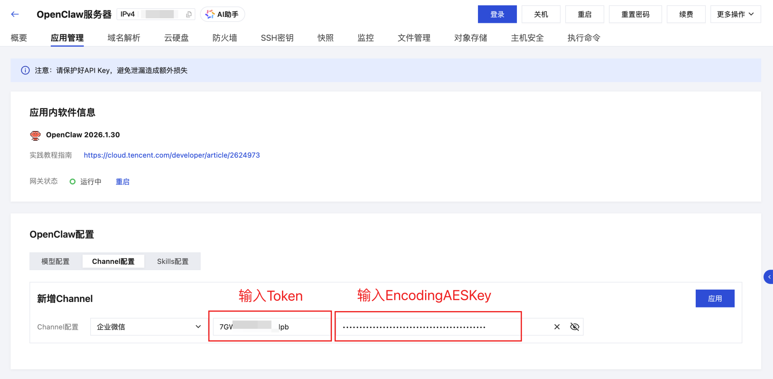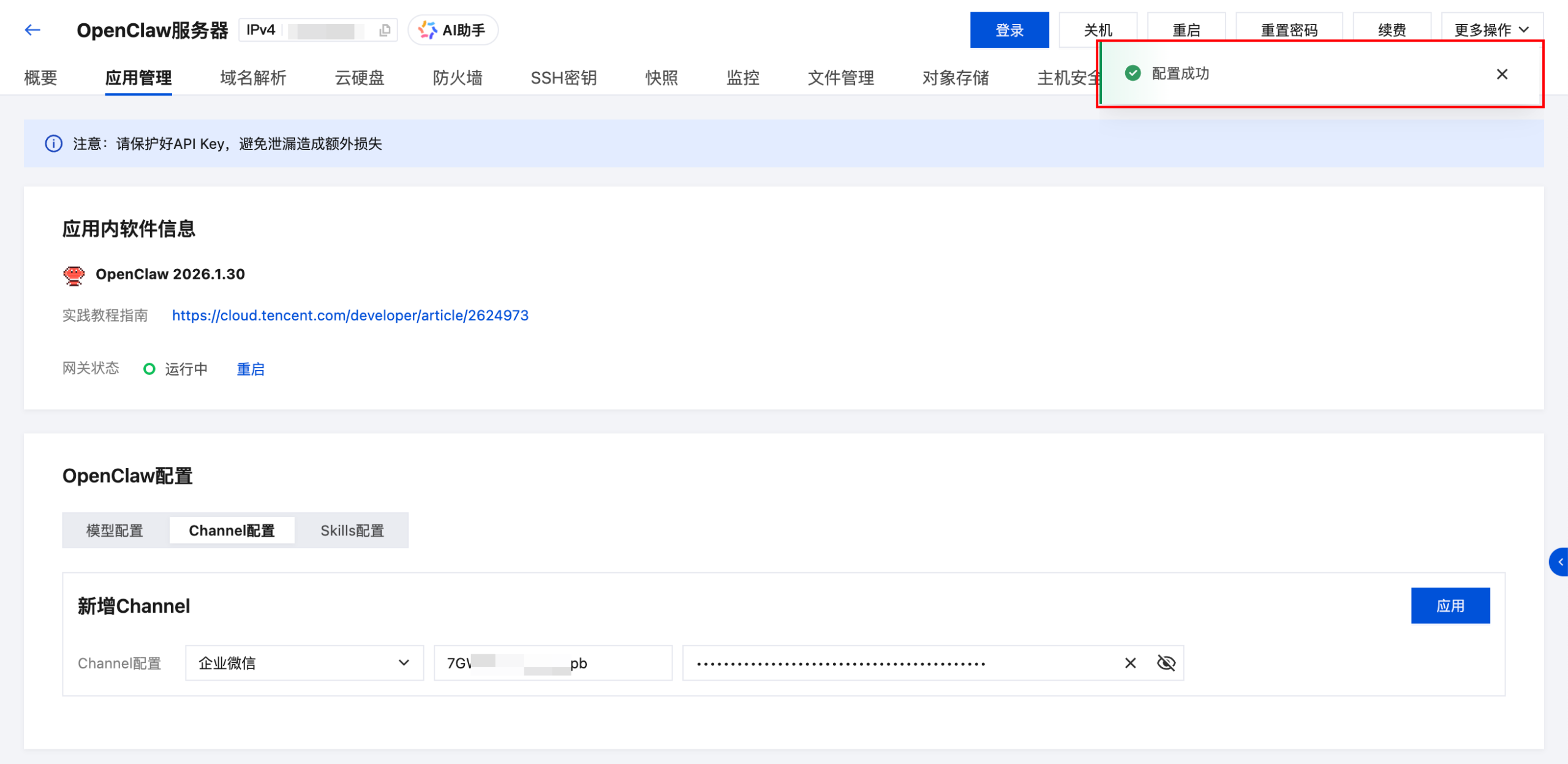 提示:点击“应用”按钮完成Channel配置之后,部分老版本的Lighthouse服务器应用管理页面中不会展示已经配置的Channel。